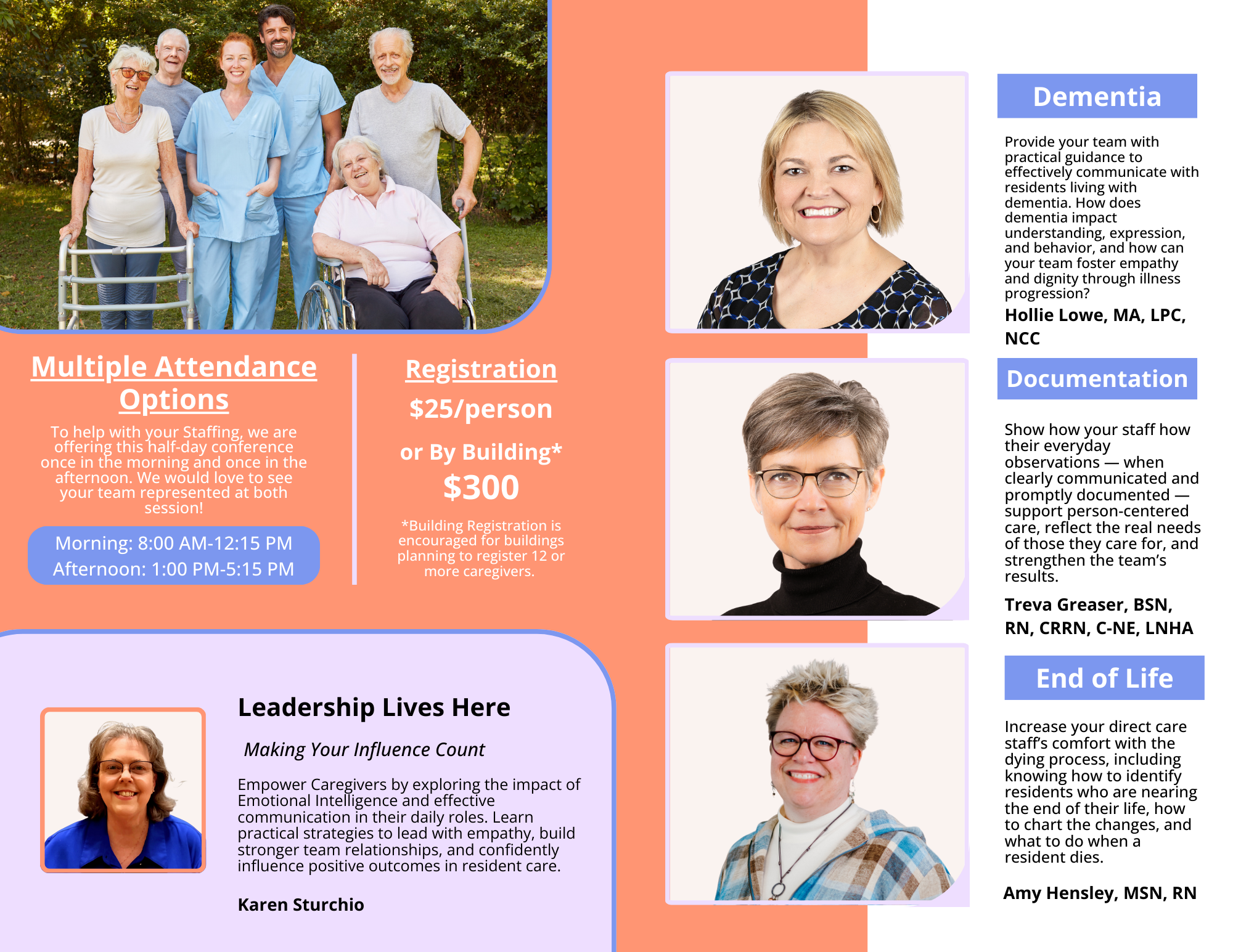 The Hands-On Caregiver Virtual Conference delivers half-day, interactive training created specifically for direct-care team members in senior living and long-term-care communities. Each session provides practical tools to strengthen communication, documentation, empathy, and leadership on the front line of care. Both sessions feature the same content — simply choose the time that works best for your schedule.